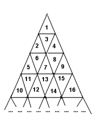 On the triangular field shown on the picture, small triangles are numbered from 1 to oo (infinity). Traveller wants to go from triangle M to triangle N. Traveller can move only through the sides of triangles, not vertices. The number of sides he crosses is called the path length.