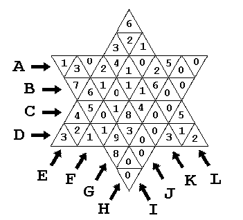 A board contains 48 triangular cells. In each cell, there is written a digit (in a range from 0 through 9). Every cell belongs to two or three lines. These lines are marked by letters from A through L.