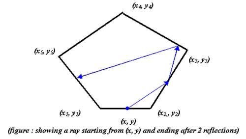 Suppose we have a convex polygon of n vertices. One of the edges have a light emitting point which emits a ray of light in a known direction. The edges of the polygon are made of mirrors. As a result when a ray falls upon an edge, it is reflected to another directon according to the laws of reflection. So after a certain number of reflections we can evaluate the point hitted by the ray. Our challenge here is to evaluate that point. By the way, if the ray falls upon a vertex of the polygon, it is lost forever.