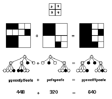 In the figure, the first example is shown (from top to bottom) as image, quadtree, pre-order string (defined below) and number of pixels. The quadrant numbering is shown at the top of the figure.